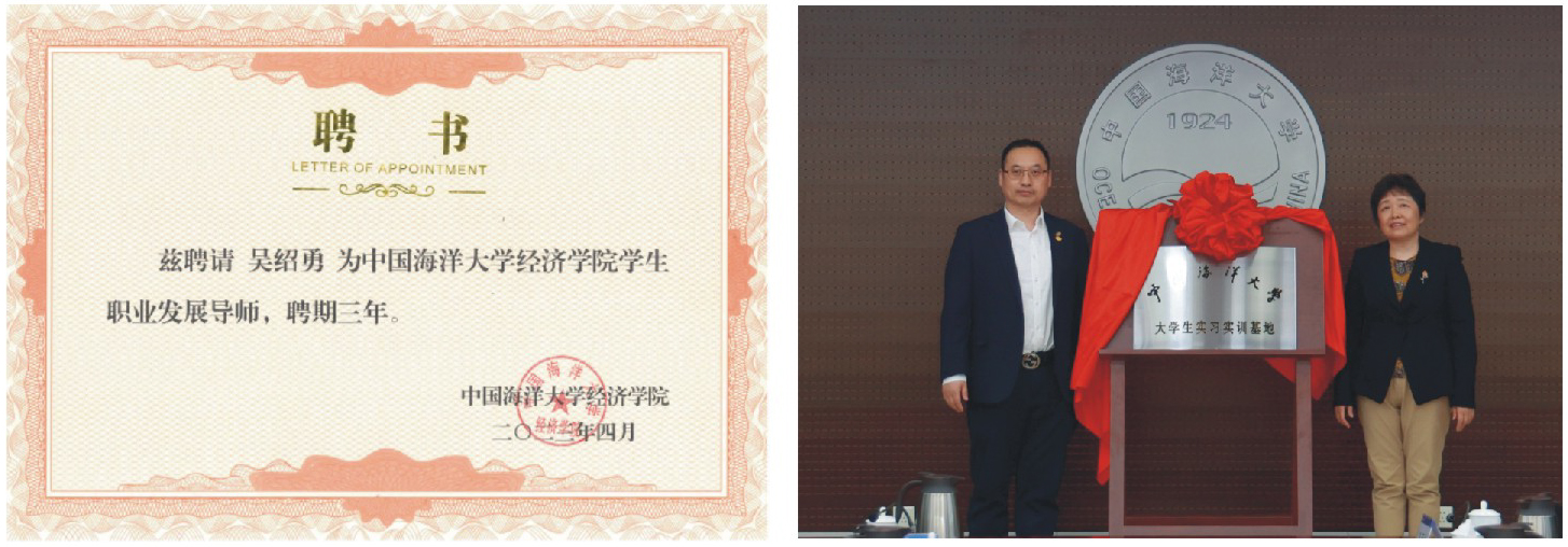 在中国海洋大学-大学生实习实训基地的揭牌仪式上,杨茂椿为吴绍勇总裁颁发职业发展导师聘书。